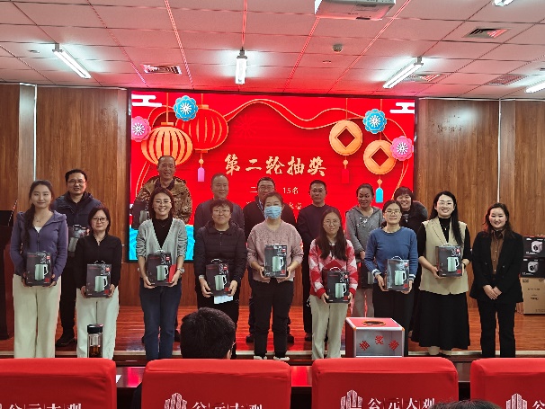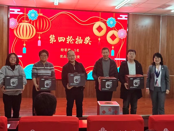 除此以外,活动还设置了由企业赞助的抽奖环节,奖品包括电饭煲、电磁炉等各类家电以及多种生活用品。现场氛围轻松愉悦,增进了教职工之间的交流与情谊。